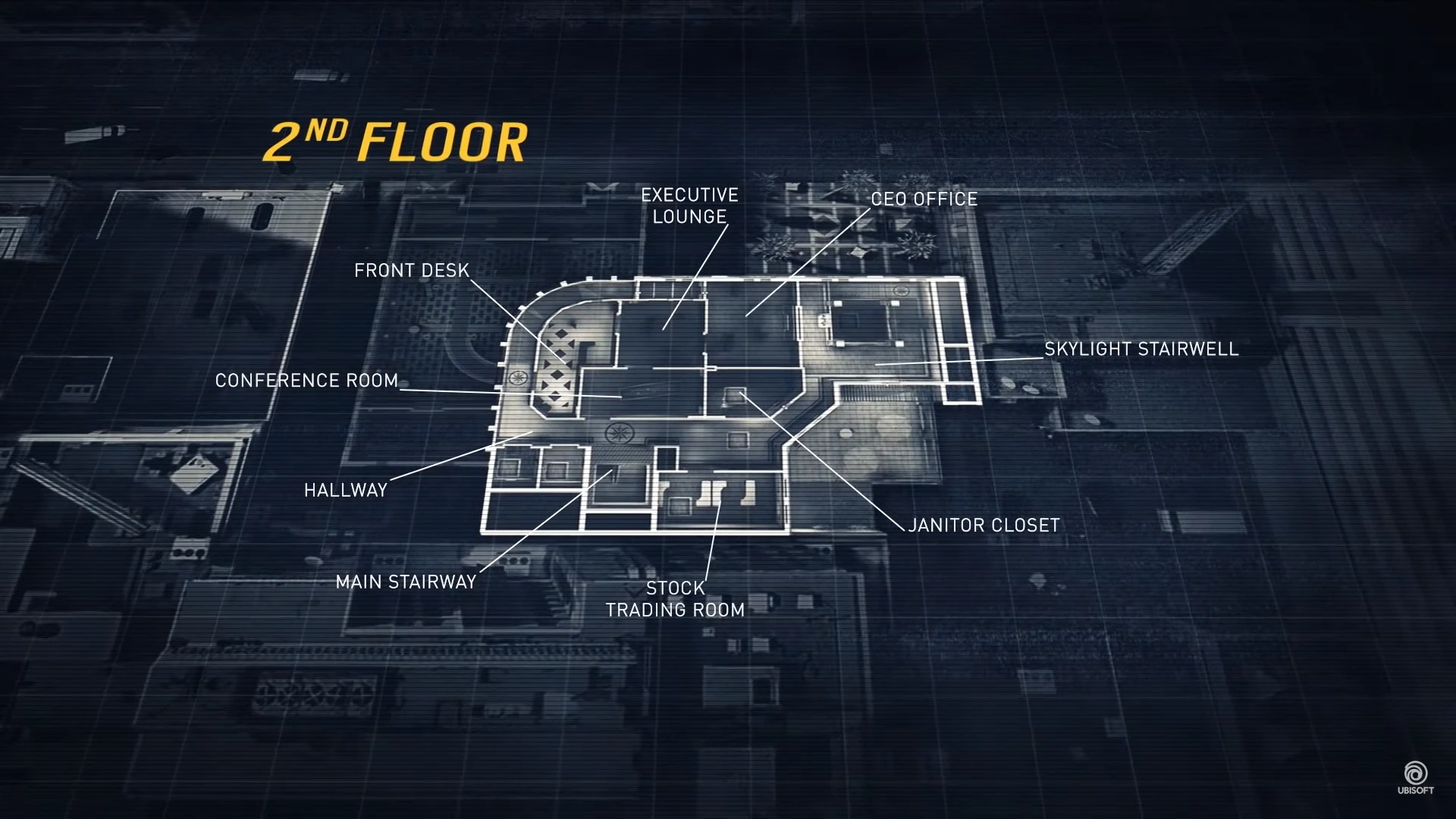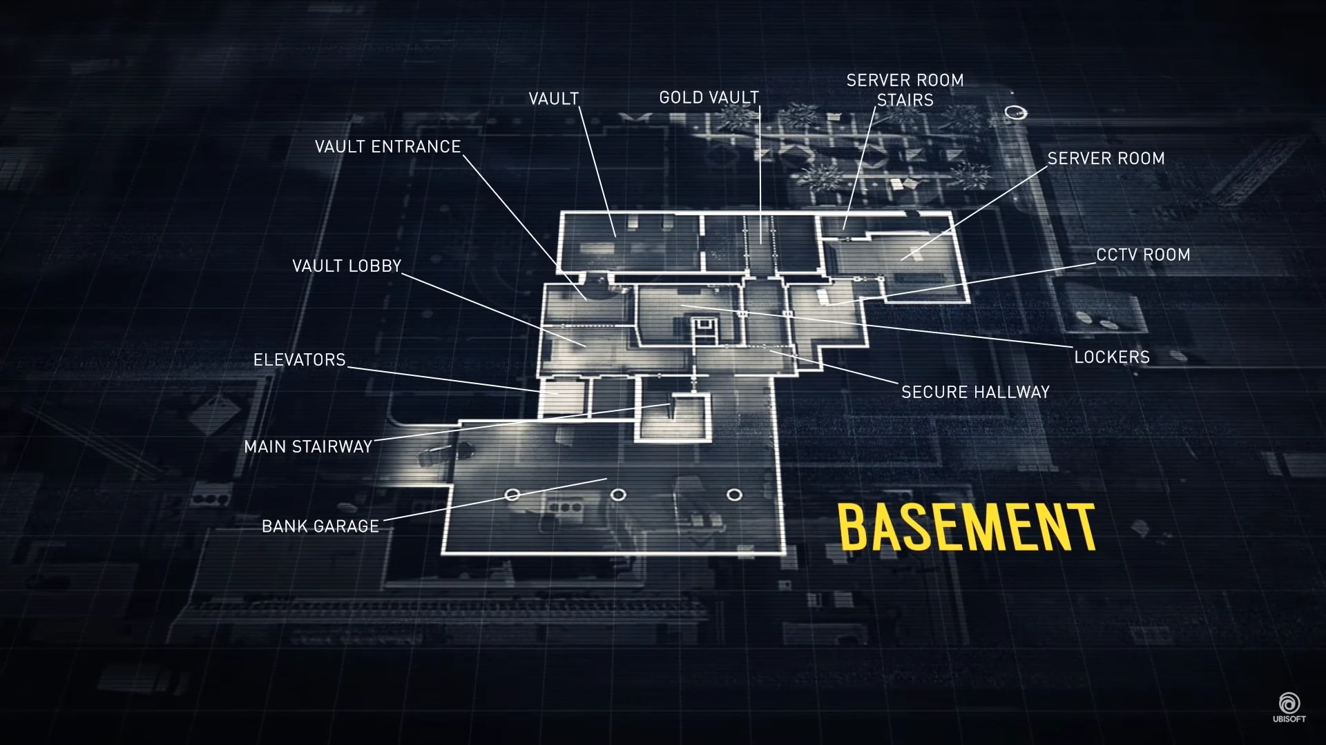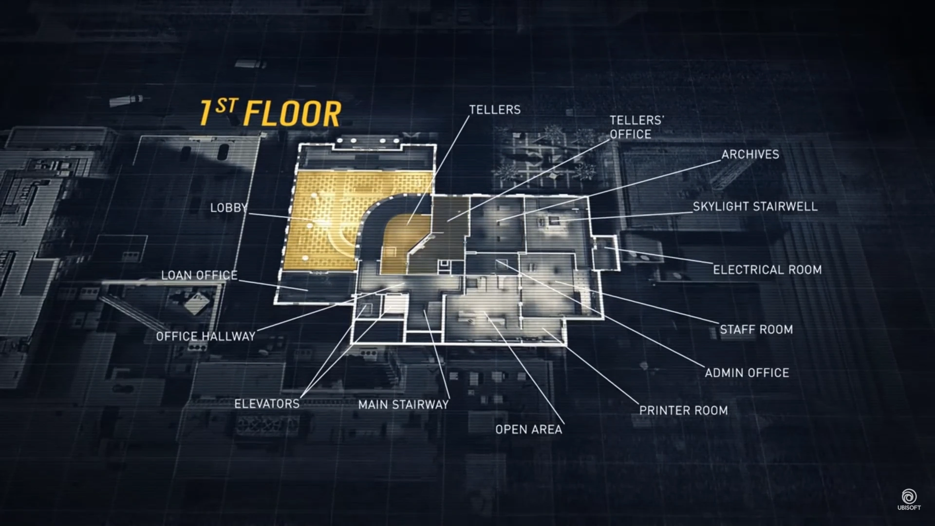 Bank is located in Los Angeles, California. It features two floors, a basement, and a roof. The bank itself is heavily fortified, meaning attackers will have a difficult time infiltrating it and locating the objective. Defenders, on the other hand, can easily reinforce the small rooms within.