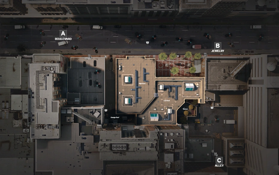 The Bank is surrounded by three spawn points for the Attackers: Boulevard, Jewelry, and Alley.