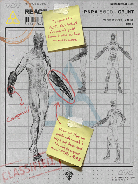 Once the Chimera Parasite has effectively assimilated enough organic matter, it will use Sprawl to start producing Archæan Grunts in lieu of human Grunts. An Archæan Grunt features a more alien appearance but retains the same role of protecting the Parasite from threats in its environment. They also retain two hardened upper limb spikes which act as its primary form of attack.