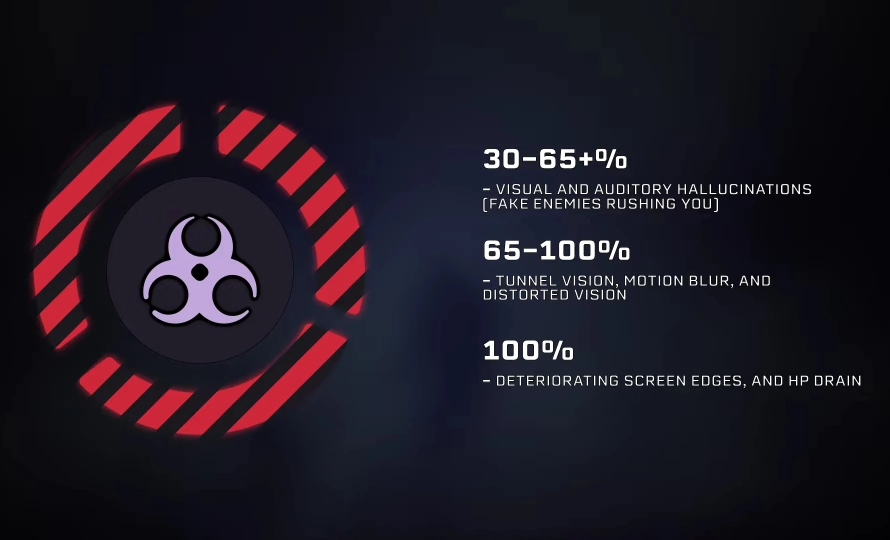 The high difficulty of the event stems from the fog produced by the Toxic Tree. This purple fog is present on all three subzones. Aside from severely limiting vision like Chimera Fog, this fog causes hallucinigenic effects depending on a player's exposure level which is shown on a meter on the lower left side of the screen. At 30% exposure, players will start hallucinating sounds and see enemies that arent really there, potentially causing players to waste resources and distracting them from real enemies. Halluicinated enemies will either stand stll, rush at players, rapidly appear and disappear, or appear outside a player's field of view and disappear when looked at. At 65% exposure, players will start experiencing tunnel vision, motion blur, and distored vision. Finally, at 100% exposure, edges on a player's screen will deteriorate further and their HP will start draining.