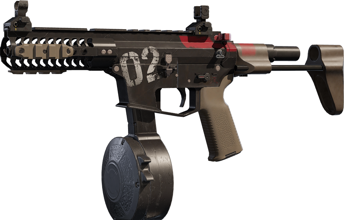 “ 9mm AR platform PDW, customized to offer Full-Automatic fire. Equipped with Drum magazine. - In-game description”