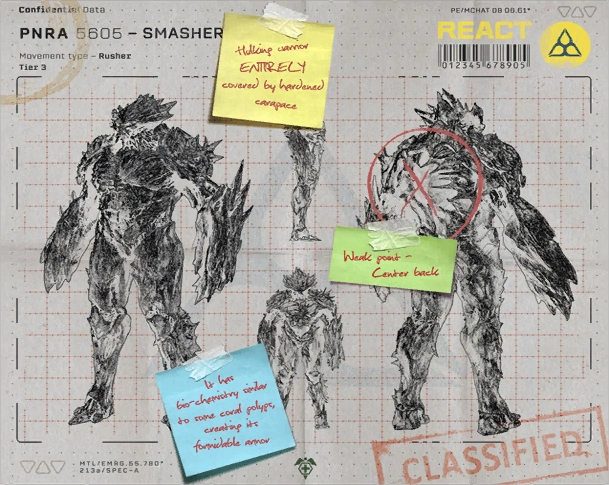 | Brief | "Evolving tactics are a must against Smashers as their dorsal Weak Point is difficult to expose. Shoot, move, and communicate. That's the name of the game." - Mira | |