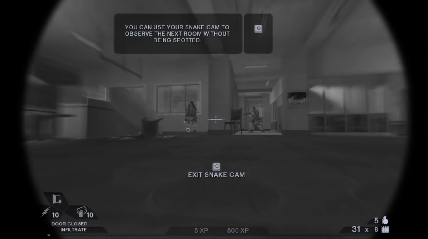The Snake Camera is a gadget featured in Tom Clancy's Rainbow Six: Vegas 2. Only available in singleplayer, it allows Bishop and Knight to peek under doors to check out the map and enemy layout in the next room. It also allows the player to see how many tangos are inside, their position, & can be used to mark two tangos as primary or secondary targets with red icons above them for your squad or partner (if the door can be penetrated then you can mark them and shoot them through the door for some assault points) in coop mode to take out and choose which of the tactics below to use.